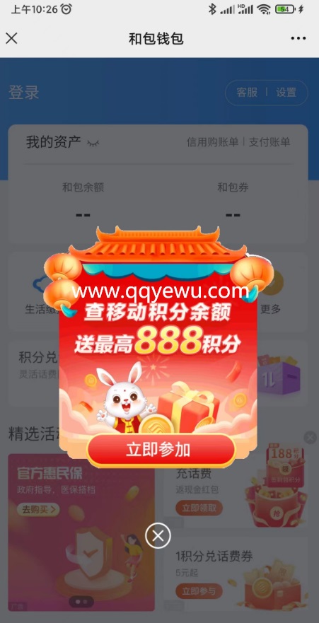 關注【中國移動和包】微信點擊菜單欄【我的】進入后有彈窗點擊參與,只需查下就可以去抽獎再兌換,累計積分可以在積分商城兌換5-10元云閃付紅包。